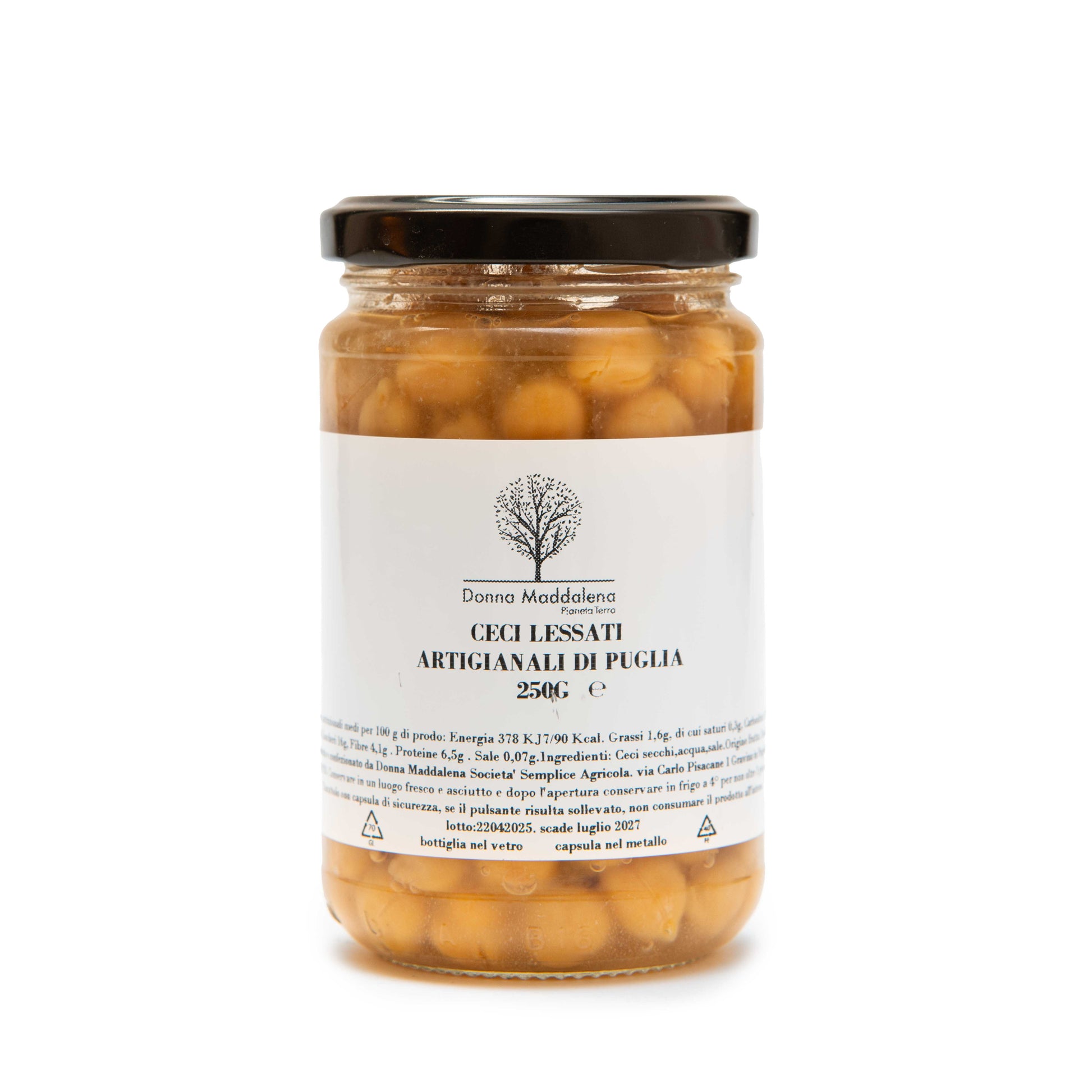 Origine e qualità: Ceci coltivati in Puglia e selezionati per grandezza e qualità. Caratteristiche sensoriali: Colore beige chiaro, consistenza morbida ma compatta, gusto delicato. Benefici e utilizzi: Fonte di proteine vegetali e fibre, perfetti per zuppe, insalate e hummus. Metodo di produzione: Lessati lentamente e confezionati in vetro senza additivi. Conservazione: Dopo apertura, conservare in frigo e consumare entro 2 giorni.