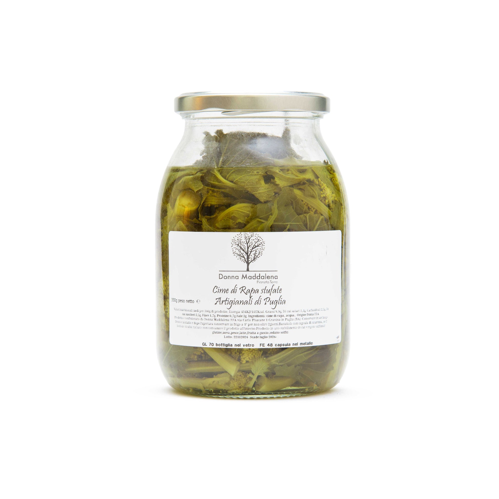 Origine e qualità: Cime di rapa fresche coltivate in Puglia. Caratteristiche sensoriali: Colore verde intenso, consistenza tenera, sapore deciso. Benefici e utilizzi: Ideali come contorno o per arricchire piatti tipici. Metodo di produzione: Lavorazione artigianale. Conservazione: Tenere in luogo fresco e asciutto, consumare entro pochi giorni dall'apertura.